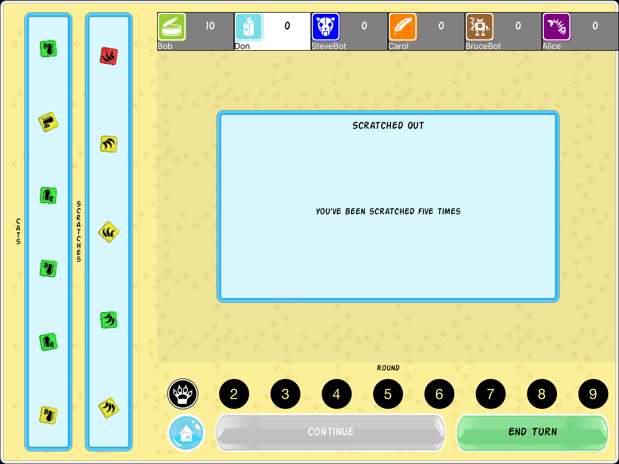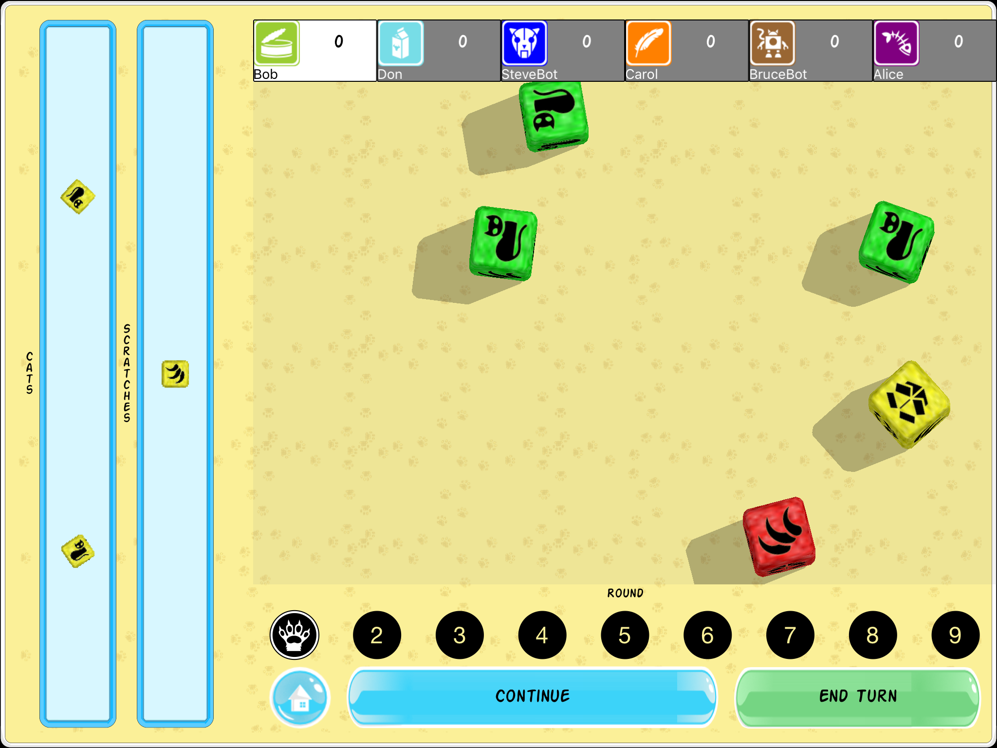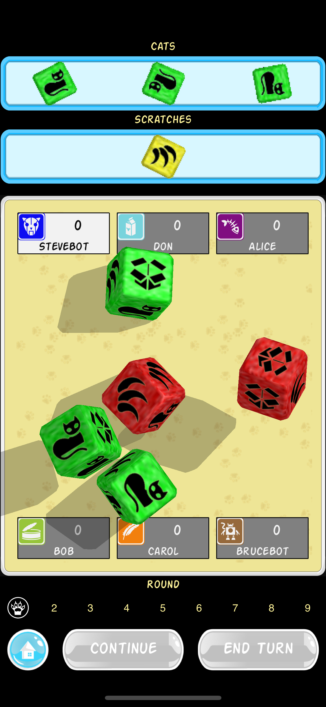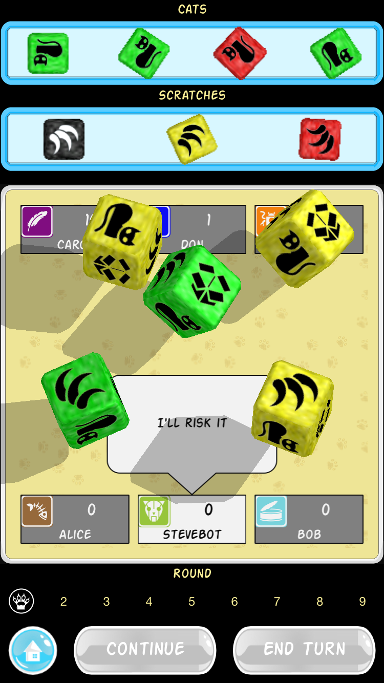 Push your luck to get more cats, or play it safe with what you've got, because if you roll a fifth scratch your turn ends without any points.