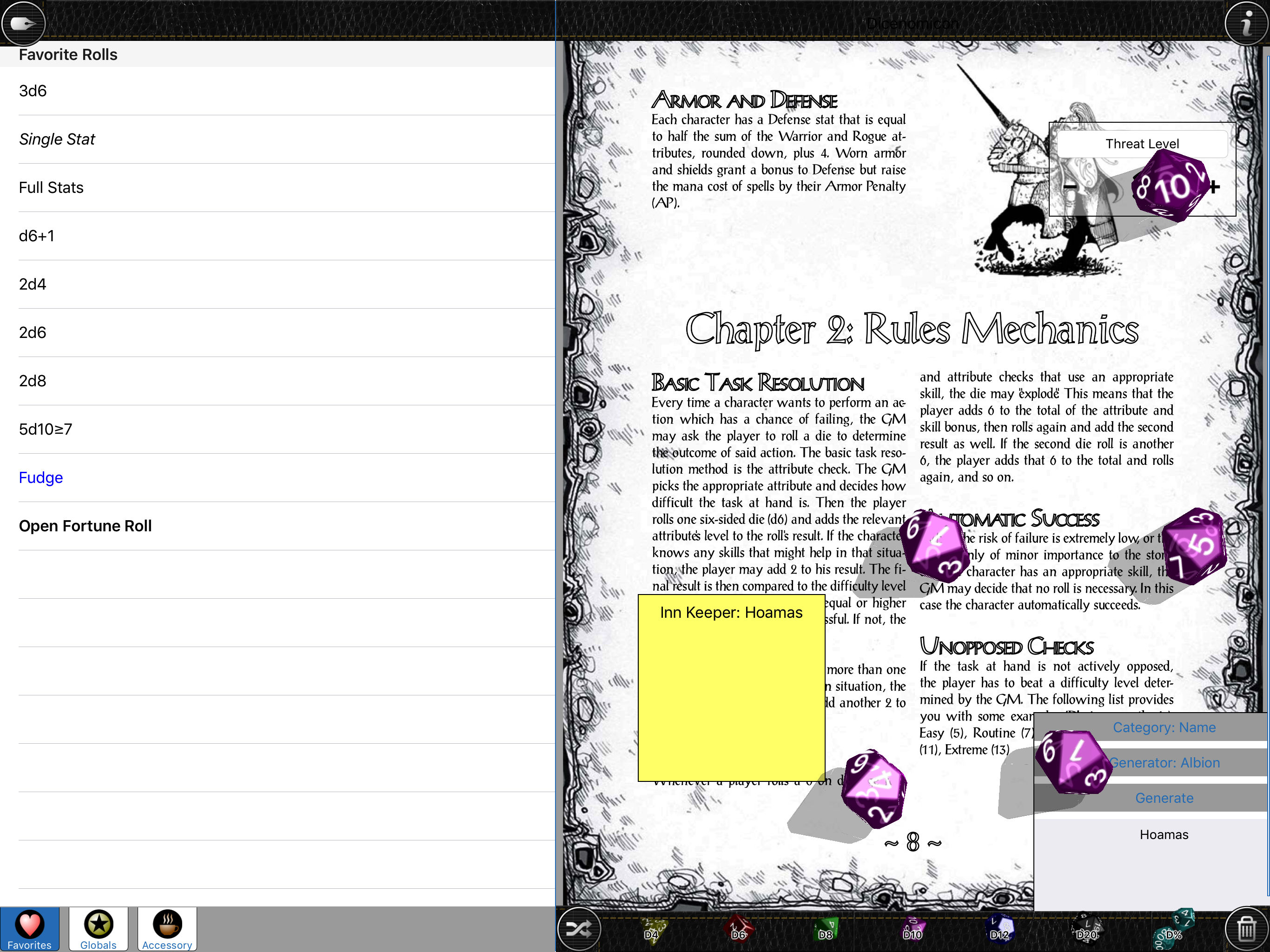 Character sheets encapsulate game rolls and character information for a wide range of games (fully customizable via XML). This can include rolls specific for a given game system (or even dice specific for a given game system), as well as integration into the built in utilities