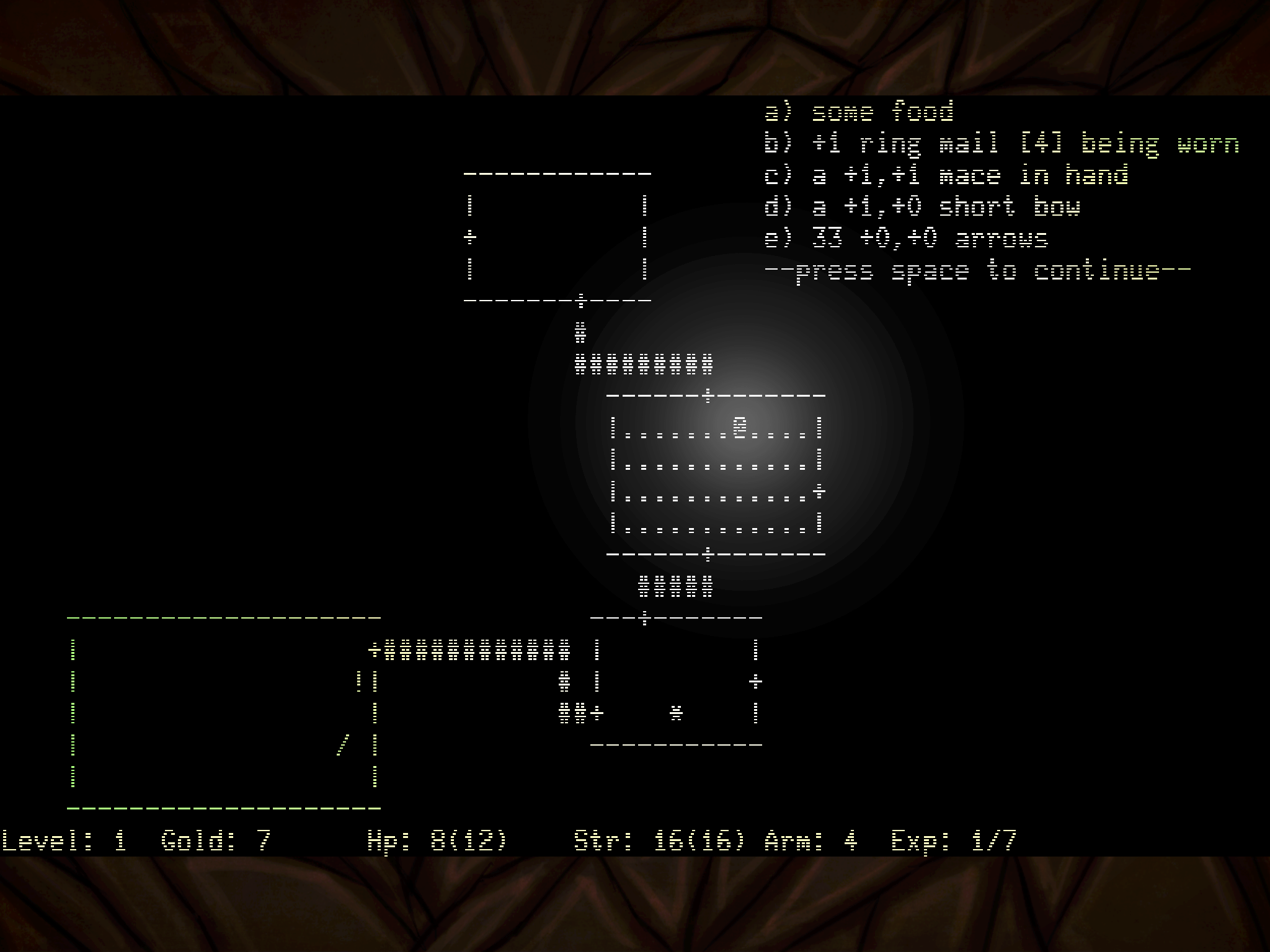 In Rogue, players control a character as they explore several levels of a dungeon as they seek the Amulet of Yendor located in the dungeon's lowest level. The player-character must fend off an array of monsters that roam the dungeons. Along the way, they can collect treasures that can help them offensively or defensively, such as weapons, armor, potions, scrolls, and other magical items. Rogue is turn-based taking place on a square grid represented in ASCII or other fixed character sets, allowing players to have time to determine the best move to survive. Rogue implements permadeath as a design choice to make each action by the player meaningful: should the player-character lose all their health from combat or other means, the character is dead, and the player must restart a brand new character and cannot reload from a saved state. The dungeon levels, monster encounters, and treasures are procedurally generated on each playthrough, so that no game is the same as a previous one.